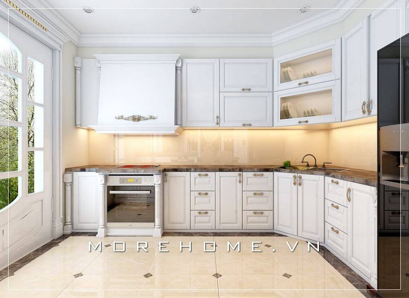 Tủ bếp gỗ việt được kiến trúc sư Morehome thiết kế với những đường chỉ viền cánh đẹp mắt