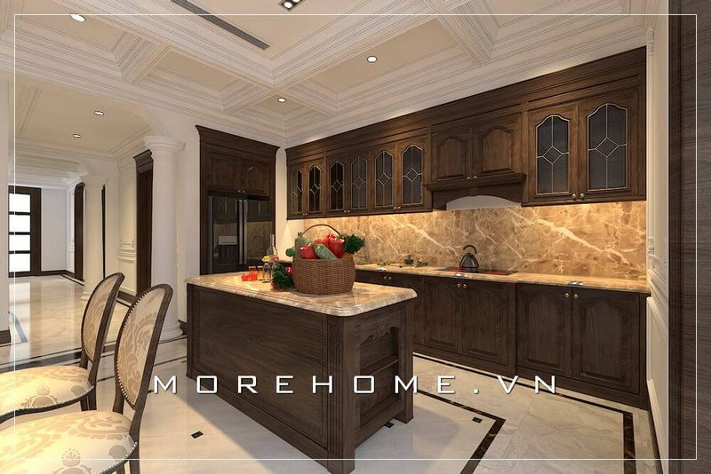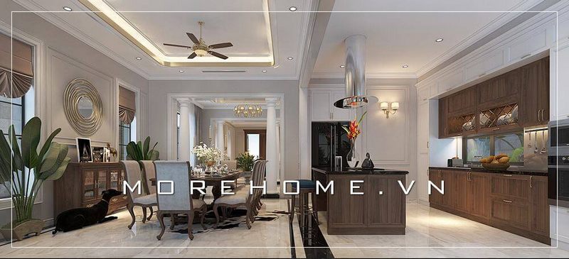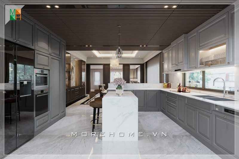 Thiết kế phòng bếp biệt thự tân cổ điển sang trọng kết hợp nội thất bếp hiện đại tạo không gian nấu nướng rộng và thoáng mát hơn.