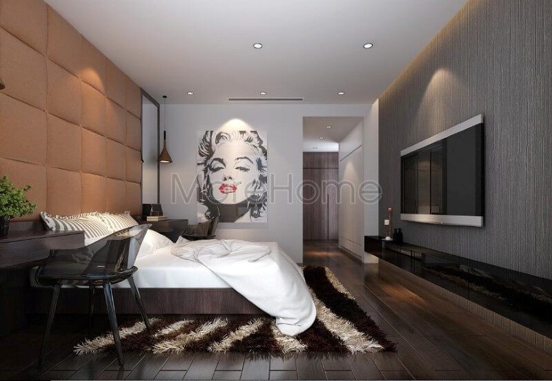 Mẫu thiết kế phòng ngủ phong cách hiện đại với nội thất gỗ óc chó cao cấp được bố trí đơn giản, tiện nghi phù hợp cho căn hộ chung cư.