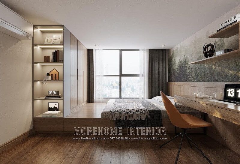 Mẫu thiết kế tủ quần áo phòng ngủ chung cư cao cấp kết hợp kệ trang trí mang lại sự tiên nghi, nhỏ gọn