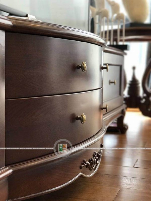 Công việc thi công kệ tivi gỗ óc chó cao cấp được thực hiện tại không gian phòng khách của biệt thự Ecopark Hưng Yên.